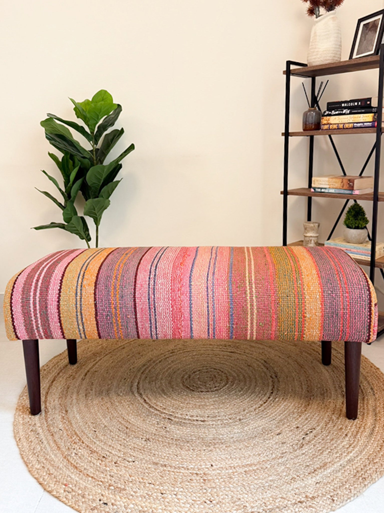 This handcrafted ottoman bench features exquisite upholstery with vibrant and rich hues, enhancing your home decor. The sturdy wooden frame offers durability and the plush cushioning ensures a cozy seating experience.