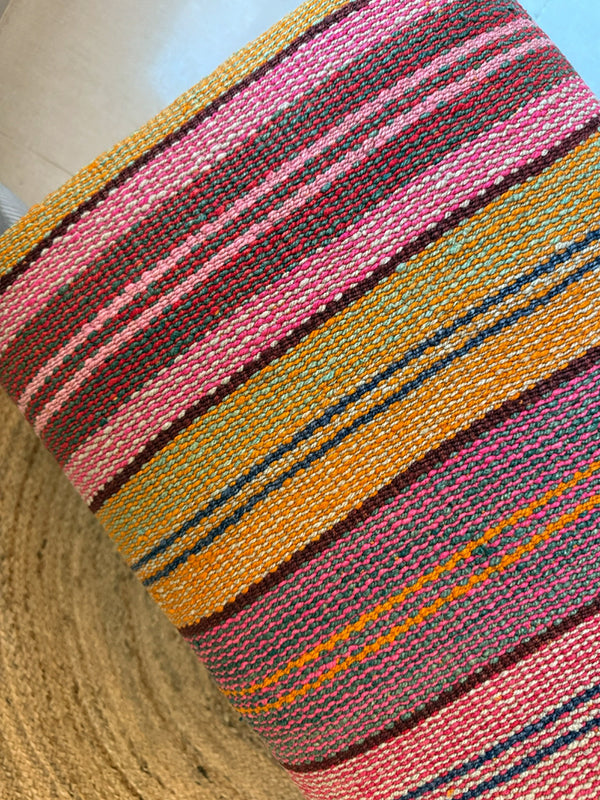 The fabric for Lazenta Collection is hand woven from natural alpaca wool and their vibrant colors are brought to life with natural dyes. As the fabric is entirely handcrafted by artisans, it may contain irregularities which help contribute to the unique and authentic charm of each piece. We hope you enjoy the distinctive beauty they bring to your space.