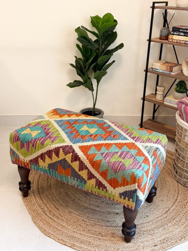 Each handcrafted ottoman bench features exquisite kilim upholstery with vibrant patterns and rich hues, enhancing your home decor. The sturdy wooden frame offers durability and the plush cushioning ensures a cozy seating experience.