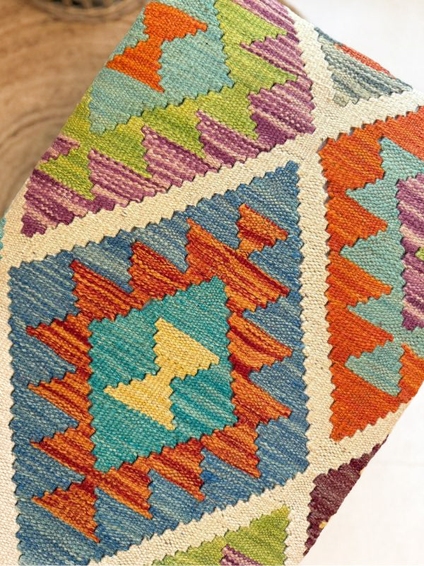 The fabric for kilim benches are hand woven and crafted from natural wool, which may result in a slightly rough texture. While this texture is a natural characteristic of the material, it contributes to the unique and authentic charm of each piece. We hope you enjoy the distinctive beauty they bring to your space.